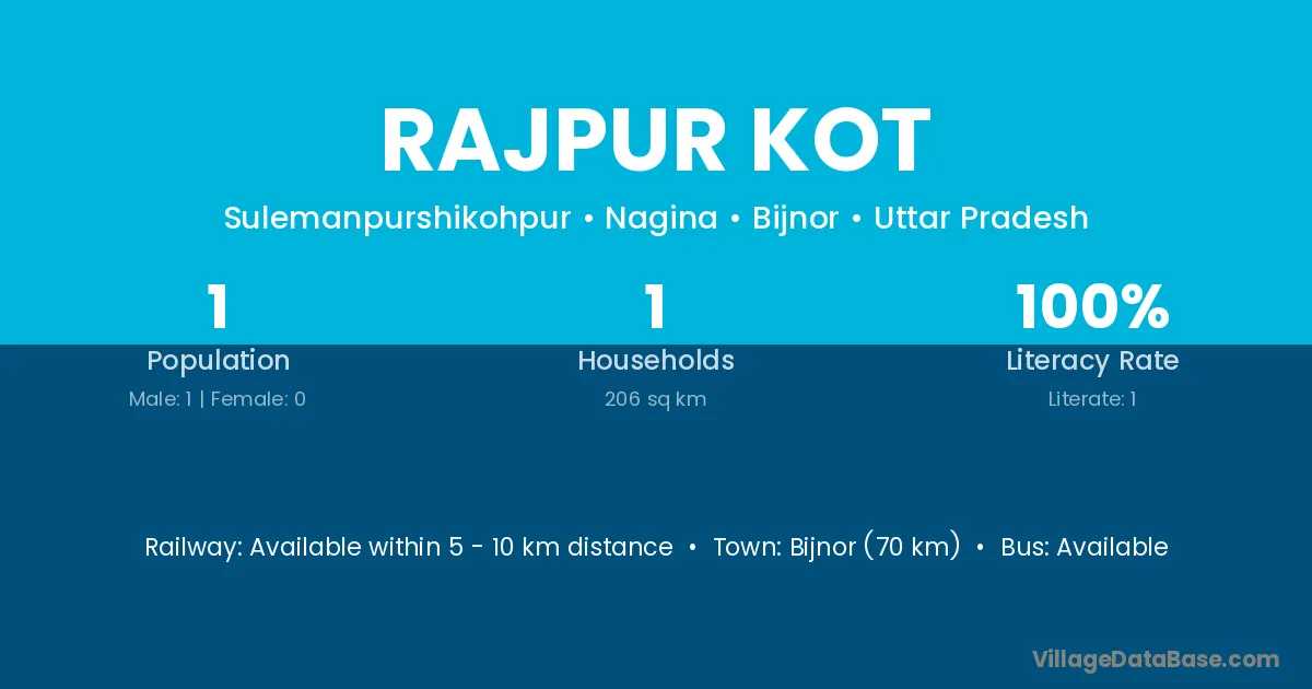 Bijnor (70 km) is the nearest town to Rajpur Kot village for major economic activities and is located approximately 70 km away.