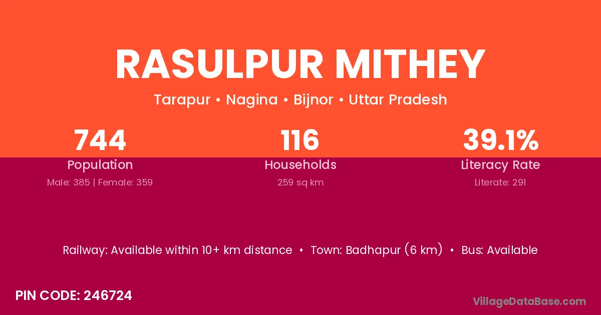 Badhapur (6 km) is the nearest town to Rasulpur Mithey village for major economic activities and is located approximately 6 km away.