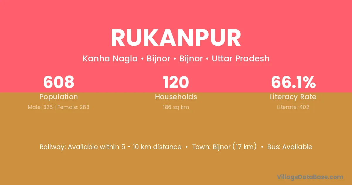 Nagina (14 km) is the nearest town to Rukanpur village for major economic activities and is located approximately 14 km away.
