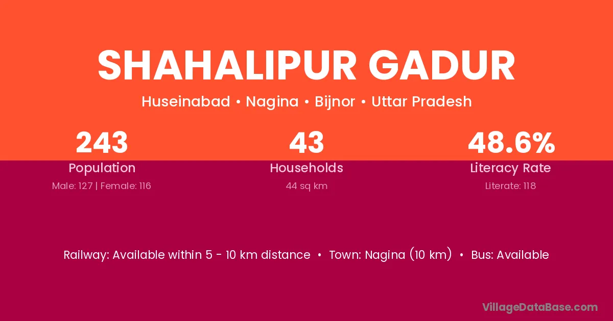 Nagina (10 km) is the nearest town to Shahalipur Gadur village for major economic activities and is located approximately 10 km away.