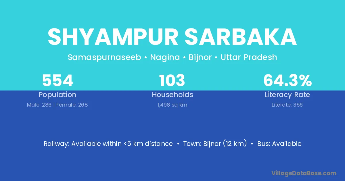Bijnor (12 km) is the nearest town to Shyampur Sarbaka village for major economic activities and is located approximately 12 km away.