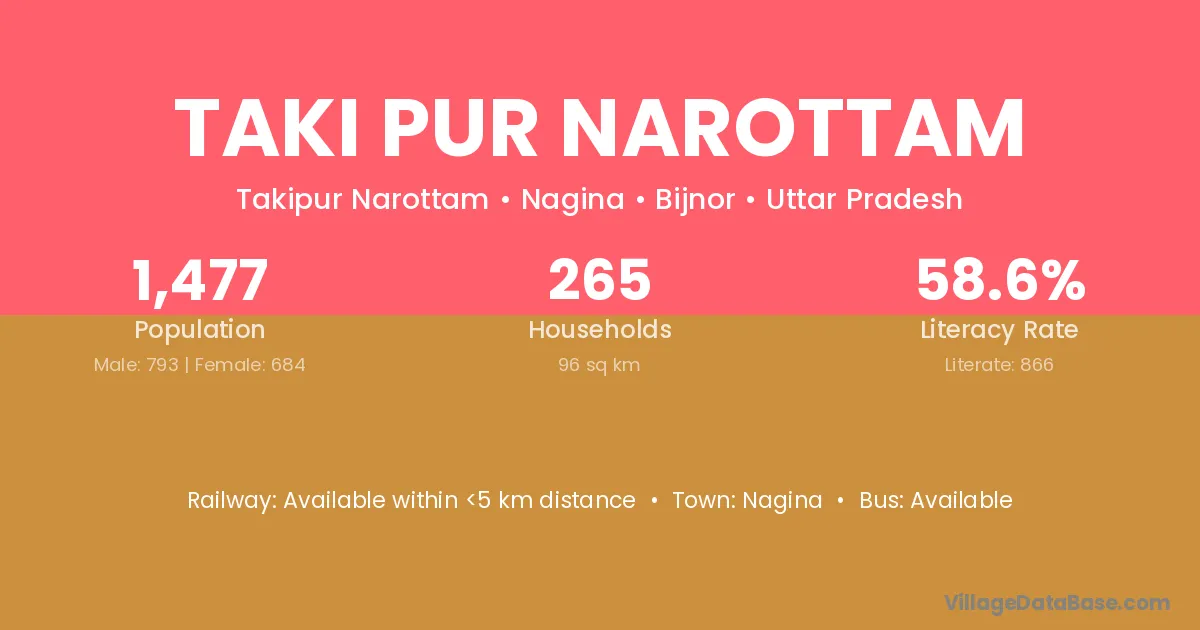 Taki Pur Narottam village has a total population of 1,477 people, of which 793 are males and 684 are females.