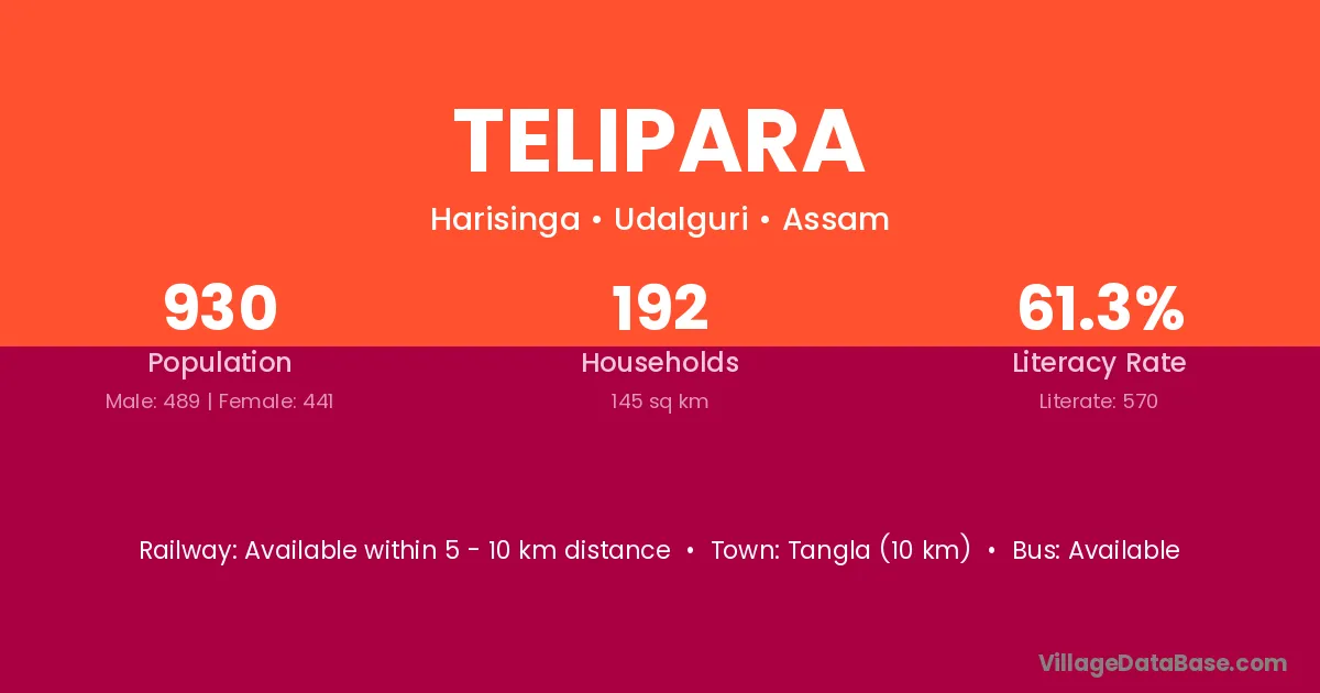 The literacy rate of Telipara village is 80.56%. Male literacy stands at 83.27% and female literacy at 78.13%.