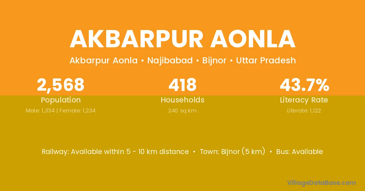 Bijnor (5 km) is the nearest town to Akbarpur Aonla village for major economic activities and is located approximately 5 km away.