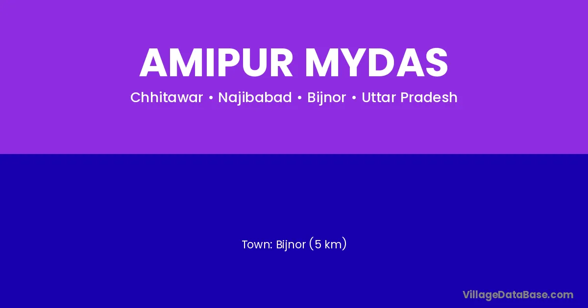 Bijnor (5 km) is the nearest town to Amipur Mydas village for major economic activities and is located approximately 5 km away.