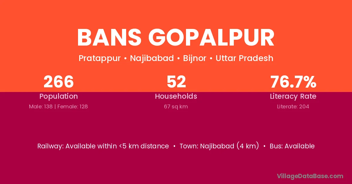 Najibabad (4 km) is the nearest town to Bans Gopalpur village for major economic activities and is located approximately 4 km away.