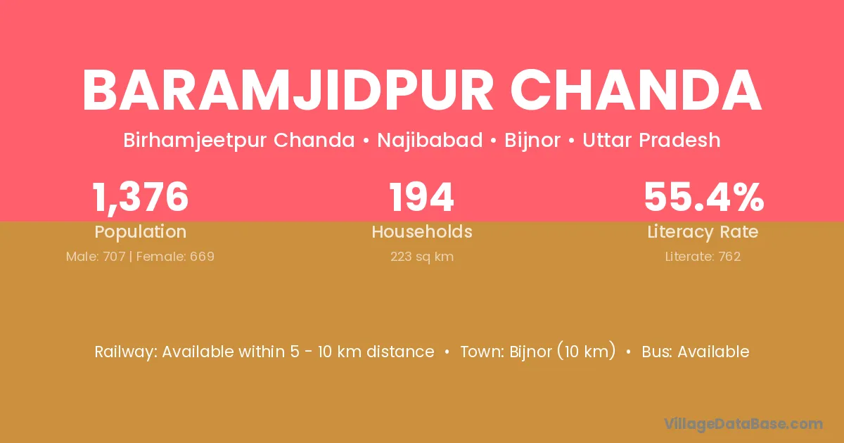 Bijnor (10 km) is the nearest town to Baramjidpur Chanda village for major economic activities and is located approximately 10 km away.