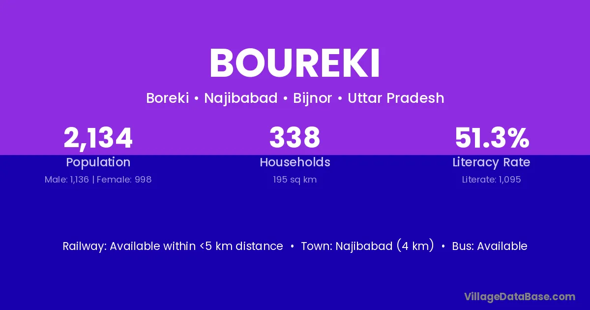 Najibabad (4 km) is the nearest town to Boureki village for major economic activities and is located approximately 4 km away.