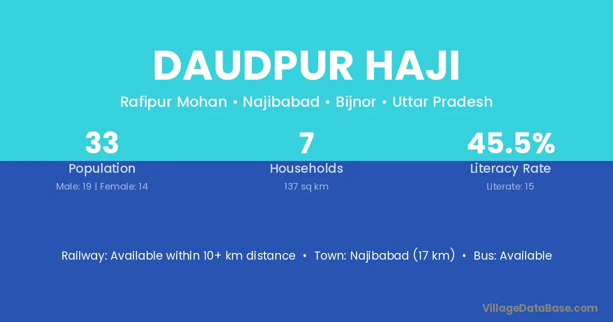 Najibabad (17 km) is the nearest town to Daudpur Haji village for major economic activities and is located approximately 17 km away.