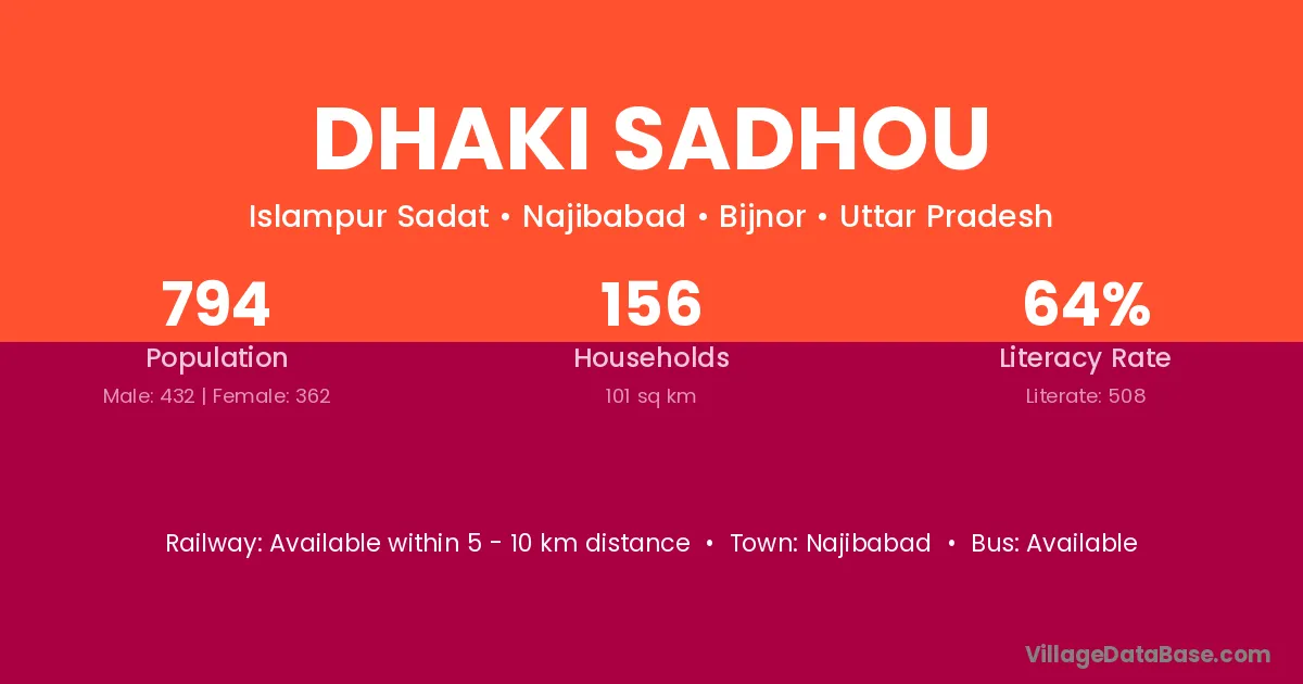 Najibabad is the nearest town to Dhaki Sadhou village for major economic activities