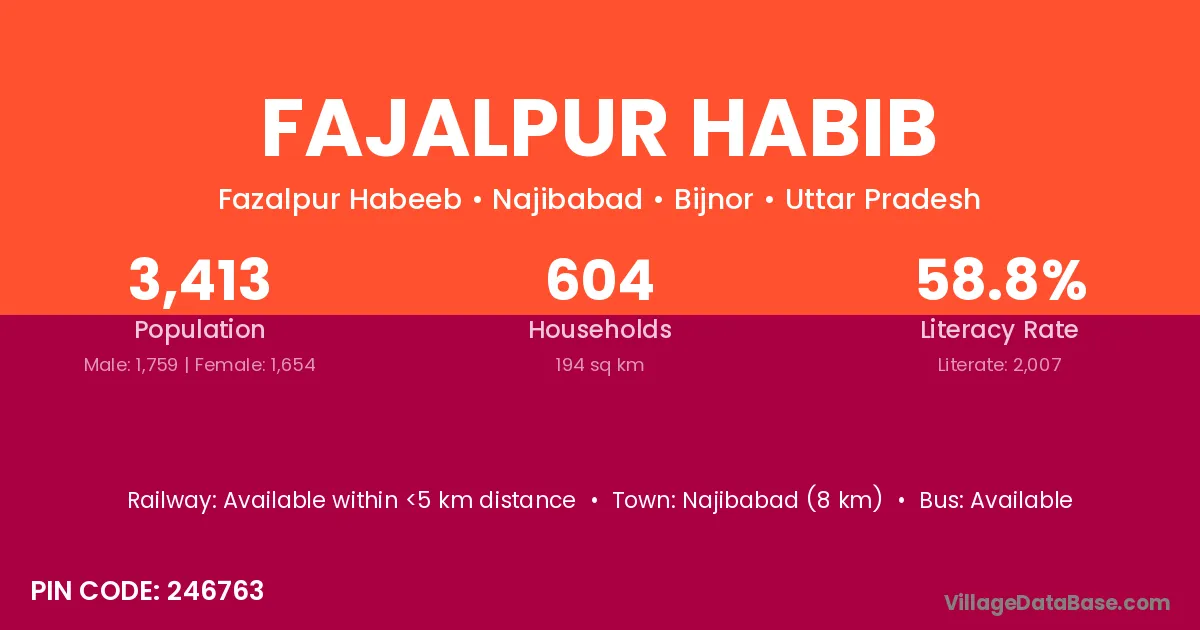 Najibabad (8 km) is the nearest town to Fajalpur Habib village for major economic activities and is located approximately 8 km away.