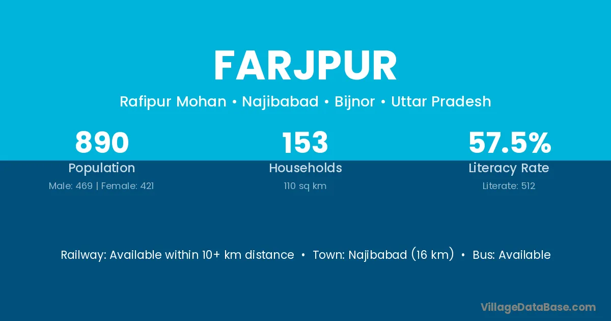Najibabad (16 km) is the nearest town to Farjpur village for major economic activities and is located approximately 16 km away.