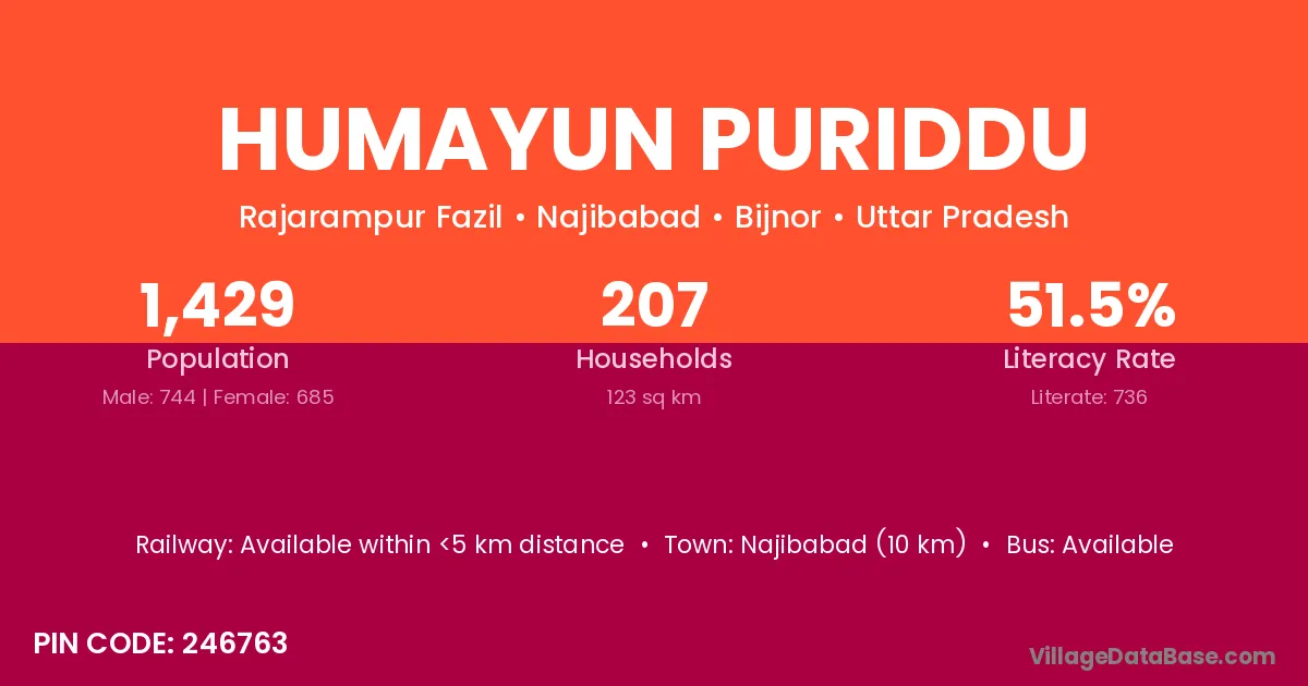 Najibabad (10 km) is the nearest town to Humayun Puriddu village for major economic activities and is located approximately 10 km away.