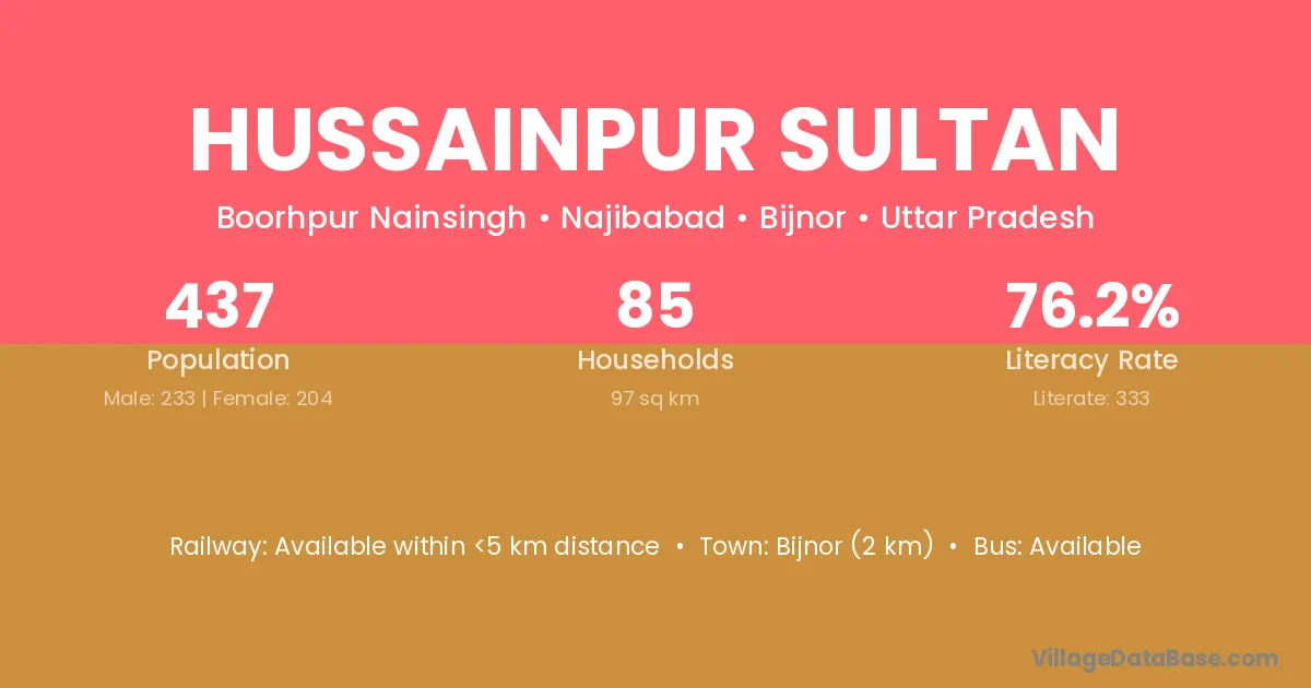 Bijnor (2 km) is the nearest town to Hussainpur Sultan village for major economic activities and is located approximately 2 km away.