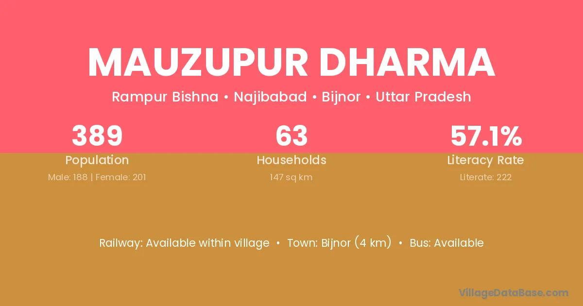 Bijnor (4 km) is the nearest town to Mauzupur Dharma village for major economic activities and is located approximately 4 km away.