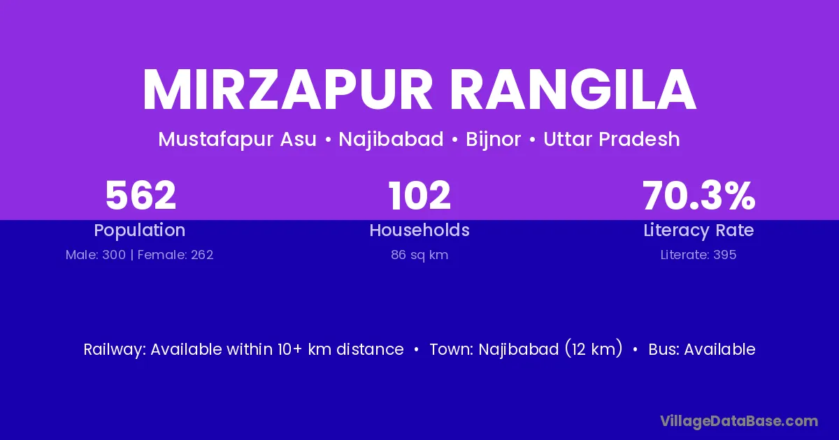 Mirzapur Rangila village has a total population of 562 people, of which 300 are males and 262 are females.