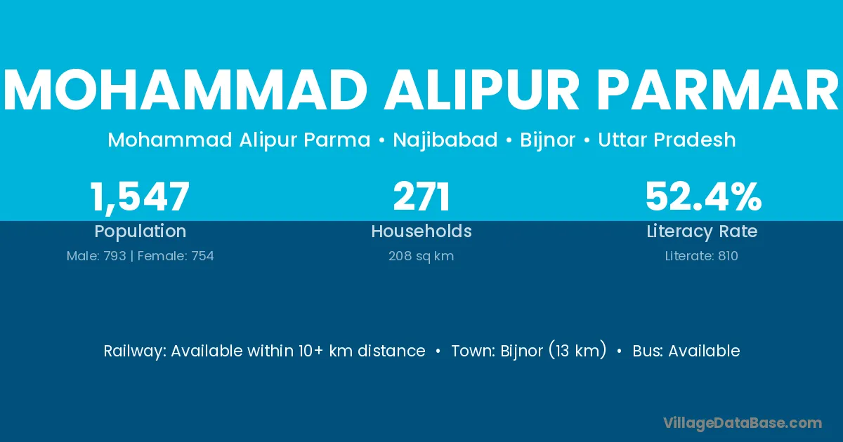 Bijnor (13 km) is the nearest town to Mohammad Alipur Parmar village for major economic activities and is located approximately 13 km away.
