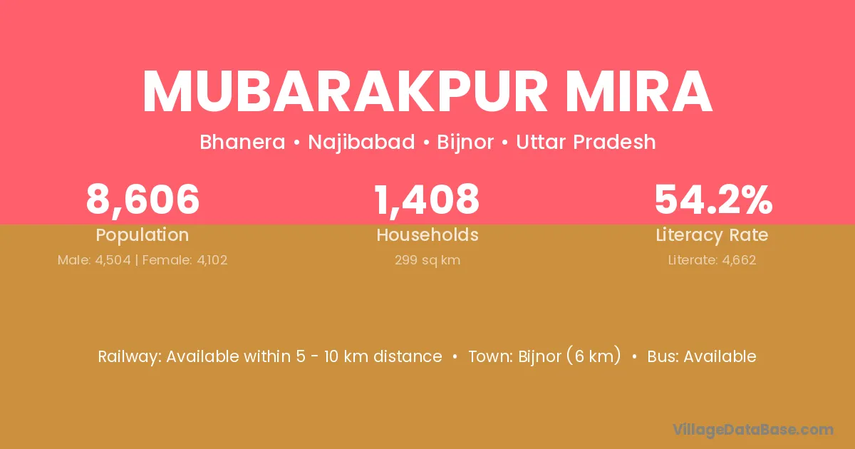 Bijnor (6 km) is the nearest town to Mubarakpur Mira village for major economic activities and is located approximately 6 km away.