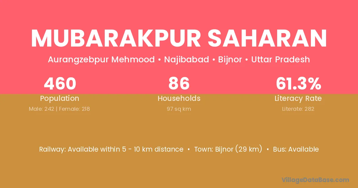 Bijnor (29 km) is the nearest town to Mubarakpur Saharan village for major economic activities and is located approximately 29 km away.