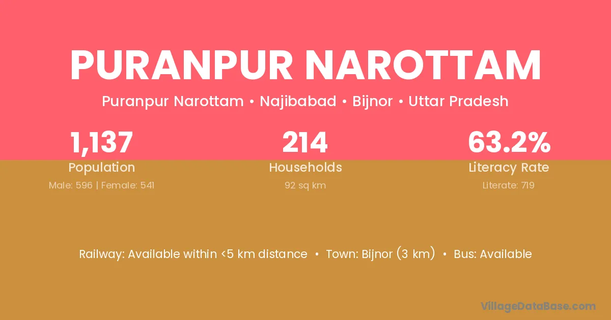 Bijnor (3 km) is the nearest town to Puranpur Narottam village for major economic activities and is located approximately 3 km away.
