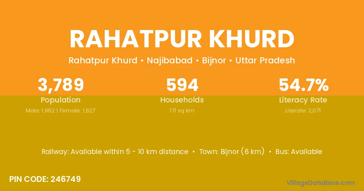 Bijnor (6 km) is the nearest town to Rahatpur Khurd village for major economic activities and is located approximately 6 km away.