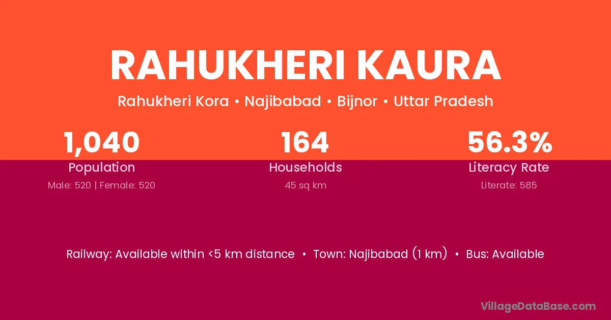 Najibabad (1 km) is the nearest town to Rahukheri Kaura village for major economic activities and is located approximately 1 km away.
