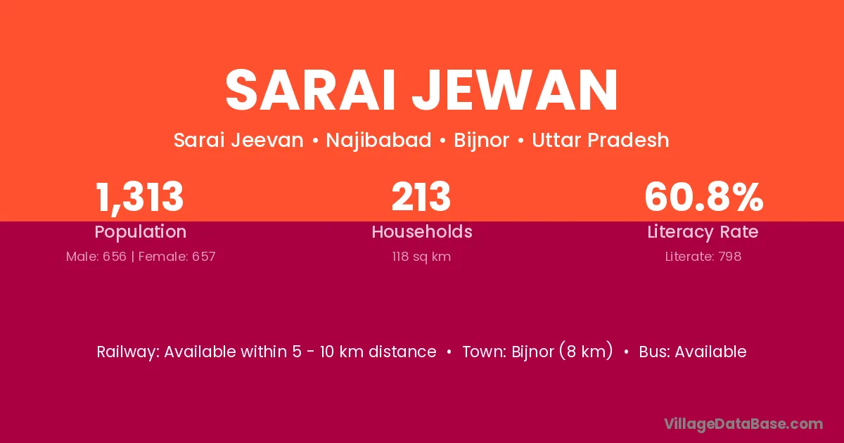 Bijnor (8 km) is the nearest town to Sarai Jewan village for major economic activities and is located approximately 8 km away.