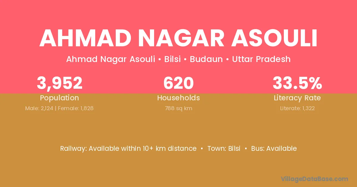 Ahmad Nagar Asouli village has a total population of 3,952 people, of which 2,124 are males and 1,828 are females.