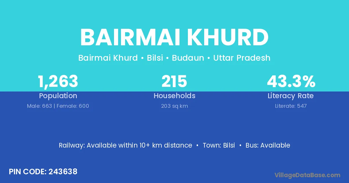 Bairmai Khurd village has a total population of 1,263 people, of which 663 are males and 600 are females.