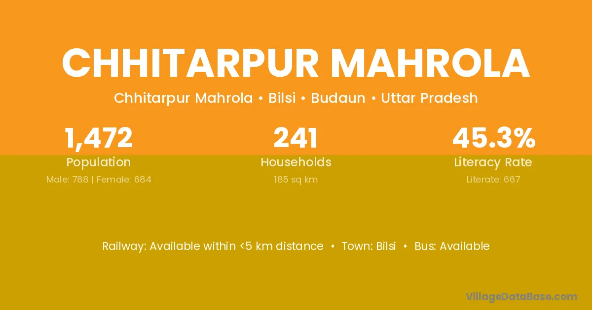 Chhitarpur Mahrola village has a total population of 1,472 people, of which 788 are males and 684 are females.