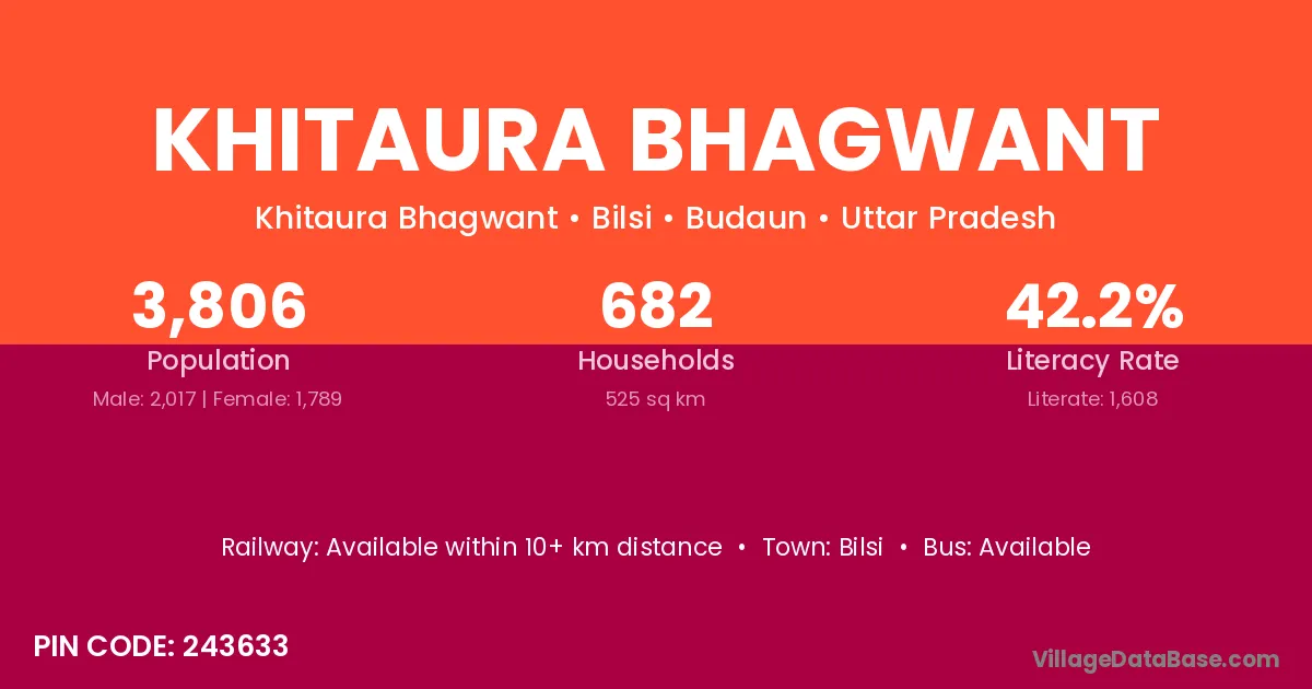 Khitaura Bhagwant village has a total population of 3,806 people, of which 2,017 are males and 1,789 are females.