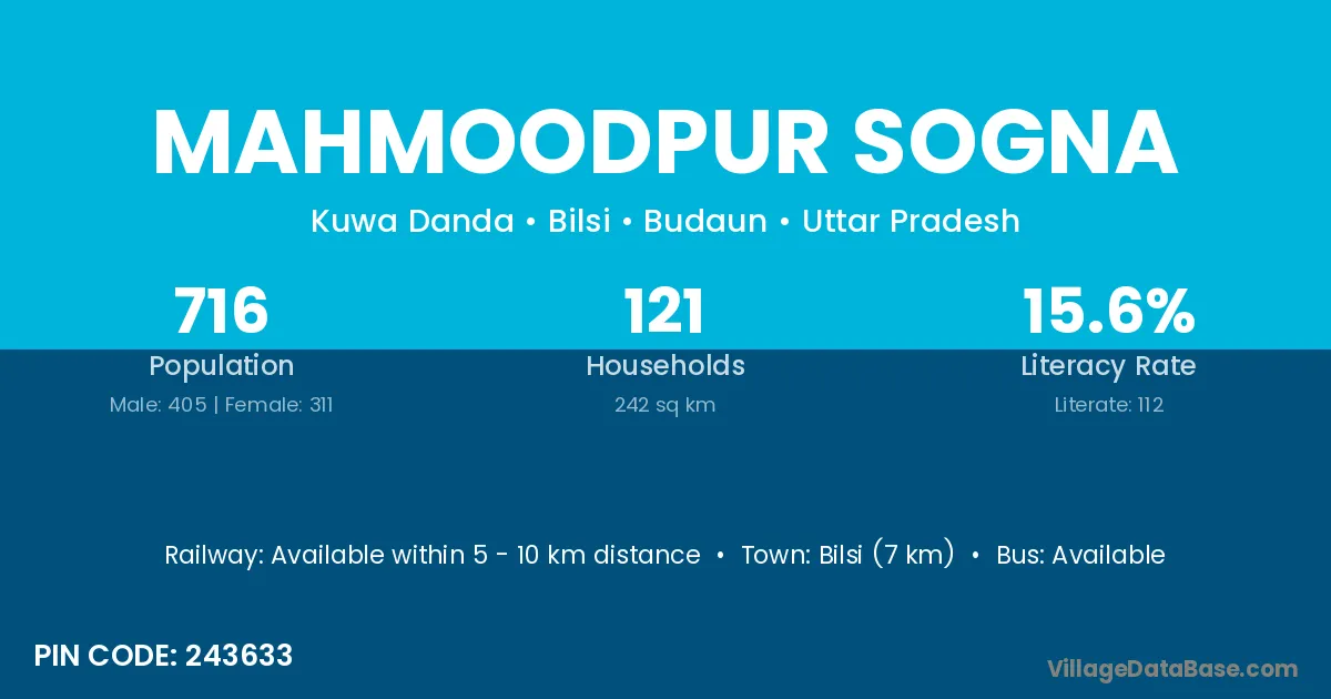 Bilsi (7 km) is the nearest town to Mahmoodpur Sogna village for major economic activities and is located approximately 7 km away.