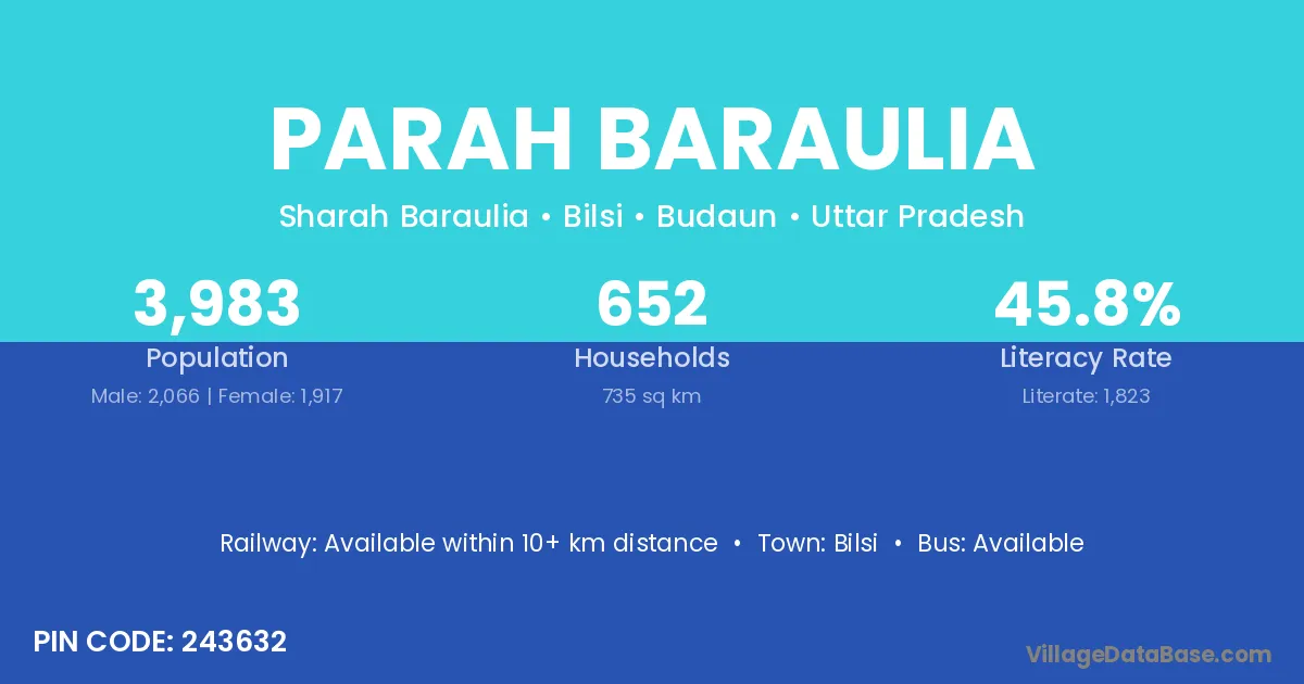 Parah Baraulia village has a total population of 3,983 people, of which 2,066 are males and 1,917 are females.