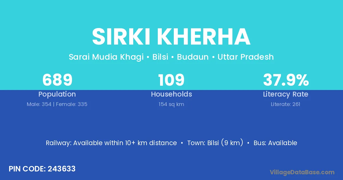 Sirki Kherha village has a total population of 689 people, of which 354 are males and 335 are females.