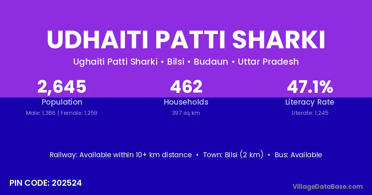 Bilsi (2 km) is the nearest town to Udhaiti Patti Sharki village for major economic activities and is located approximately 2 km away.