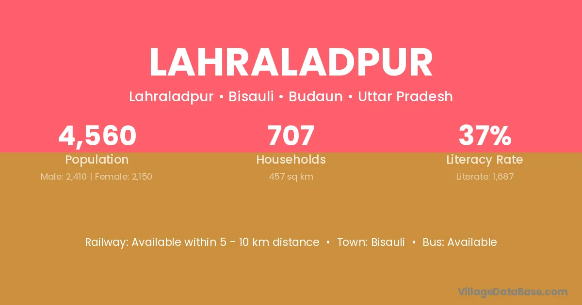 Lahraladpur village has a total population of 4,560 people, of which 2,410 are males and 2,150 are females.