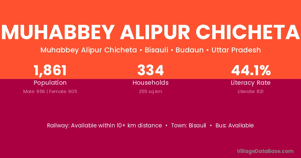 Muhabbey Alipur Chicheta village has a total population of 1,861 people, of which 956 are males and 905 are females.