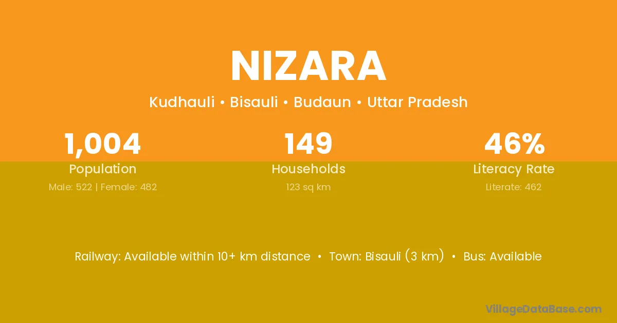Bisauli (3 km) is the nearest town to Nizara village for major economic activities and is located approximately 3 km away.