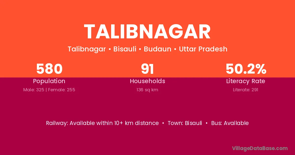 Talibnagar village has a total population of 580 people, of which 325 are males and 255 are females.