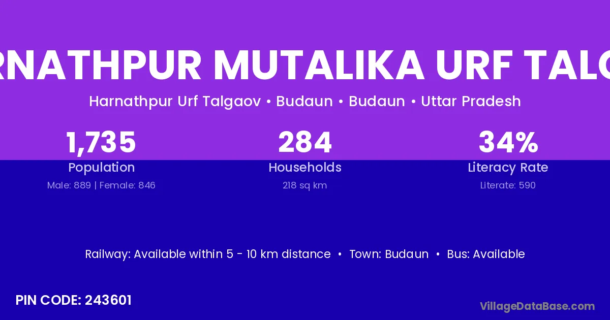 Budaun is the nearest town to Harnathpur Mutalika Urf Talgao village for major economic activities