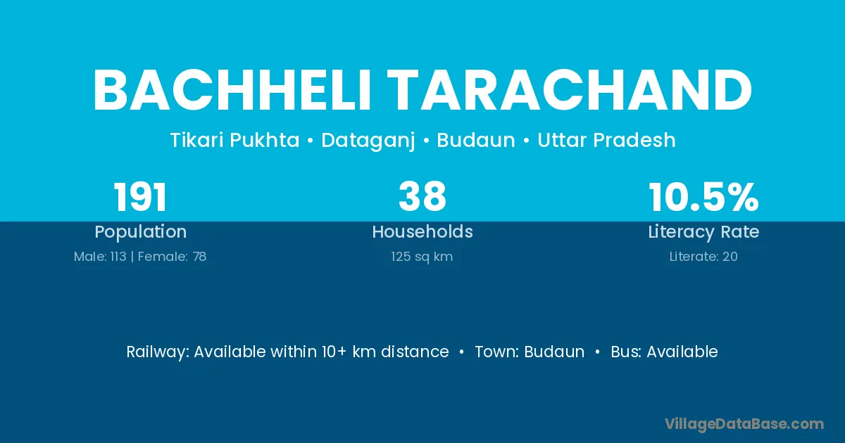 Bachheli Tarachand village has a total population of 191 people, of which 113 are males and 78 are females.