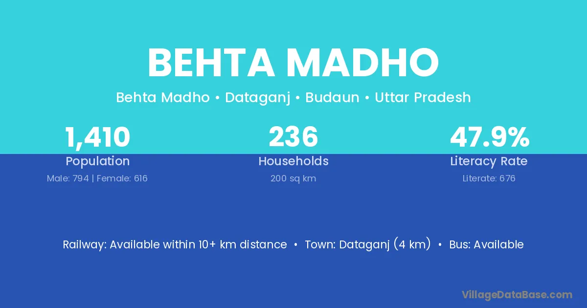 Dataganj (4 km) is the nearest town to Behta Madho village for major economic activities and is located approximately 4 km away.