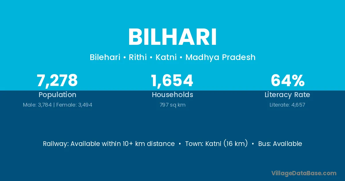 The literacy rate of Bilhari village is 47.25%. Male literacy stands at 52.53% and female literacy at 41.36%.