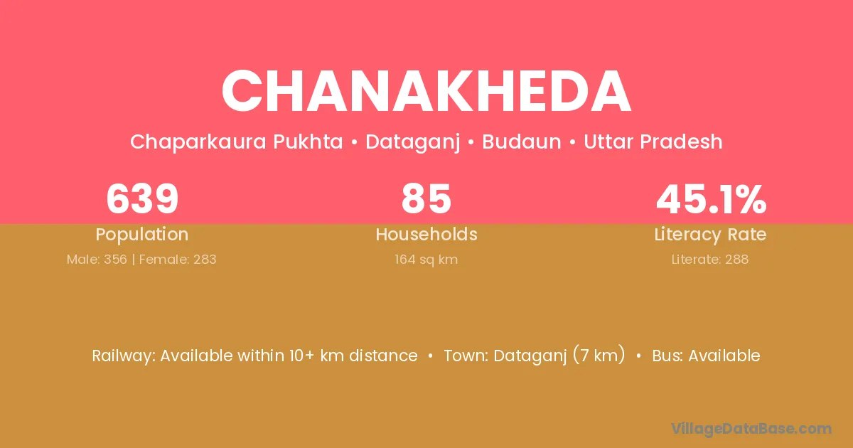 Chanakheda village has a total population of 639 people, of which 356 are males and 283 are females.