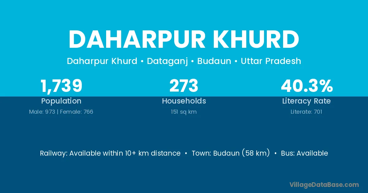 Budaun (58 km) is the nearest town to Daharpur Khurd village for major economic activities and is located approximately 58 km away.