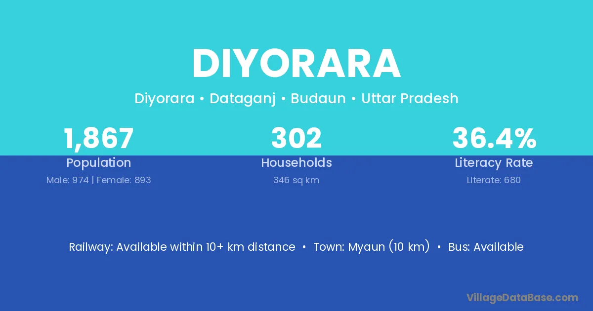 Diyorara village has a total population of 1,867 people, of which 974 are males and 893 are females.