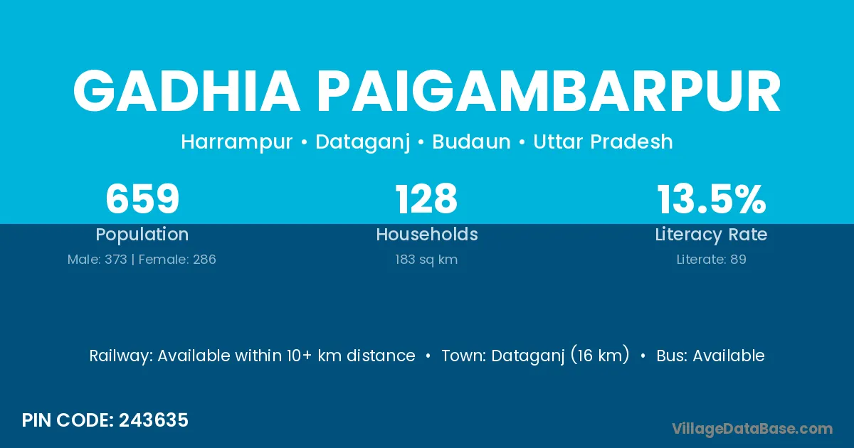 Dataganj (16 km) is the nearest town to Gadhia Paigambarpur village for major economic activities and is located approximately 16 km away.