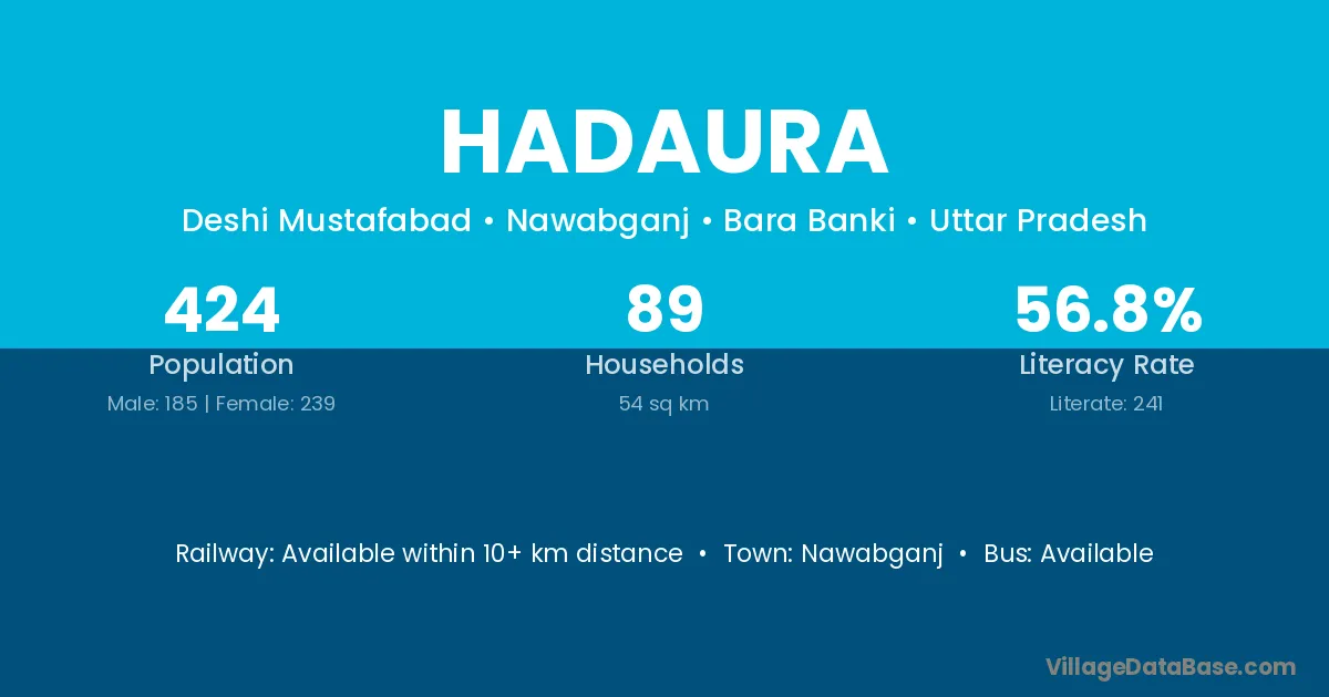 The literacy rate of Hadaura village is 22.79%. Male literacy stands at 27.60% and female literacy at 16.98%.