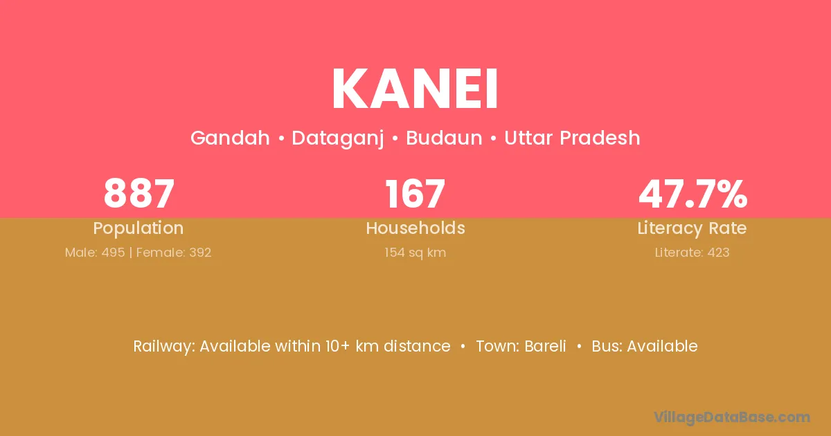 Kanei village has a total population of 887 people, of which 495 are males and 392 are females.
