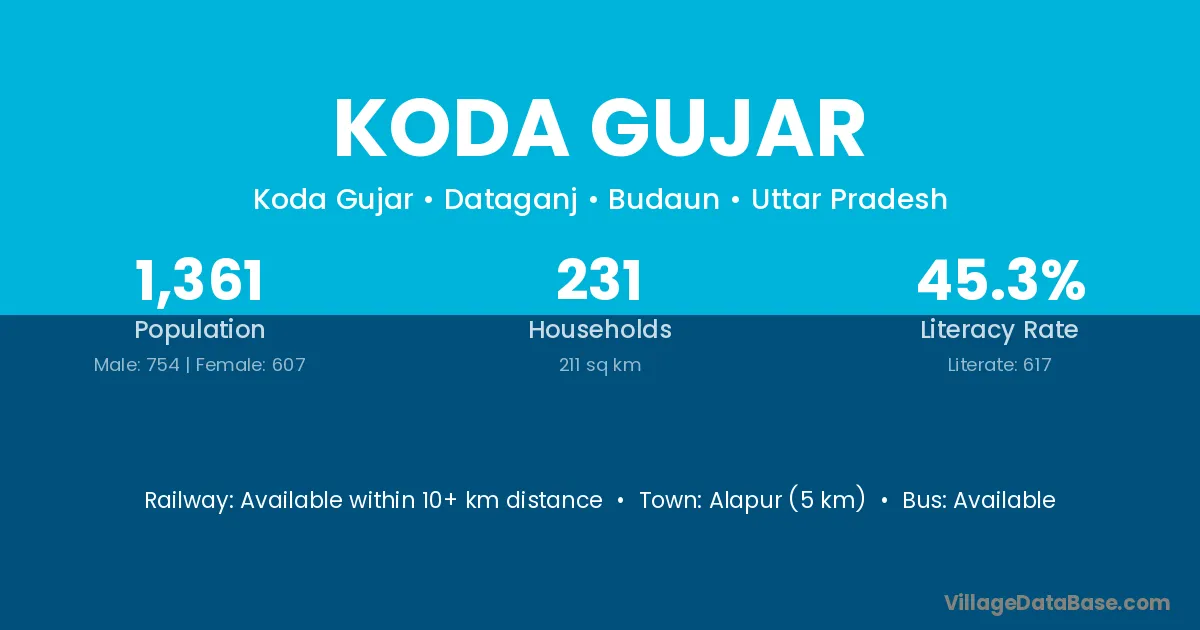 Alapur (5 km) is the nearest town to Koda Gujar village for major economic activities and is located approximately 5 km away.